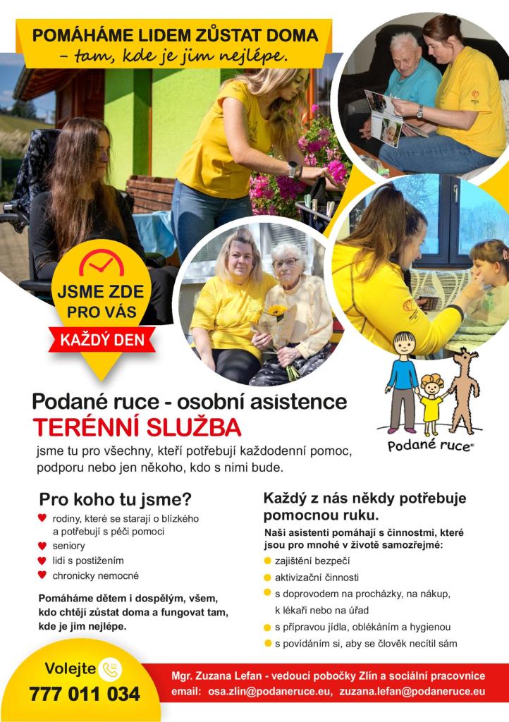 Podané ruce – osobní asistence, působí ve Zlínském kraji, a poskytuje terénní sociální službu osobní asistence. Naším cílem je umožnit lidem se sníženou soběstačností zůstat co nejdéle ve svém domácím prostředí, s podporou a důstojností. Naši asistenti pomáhají každý den, včetně víkendů a svátků.